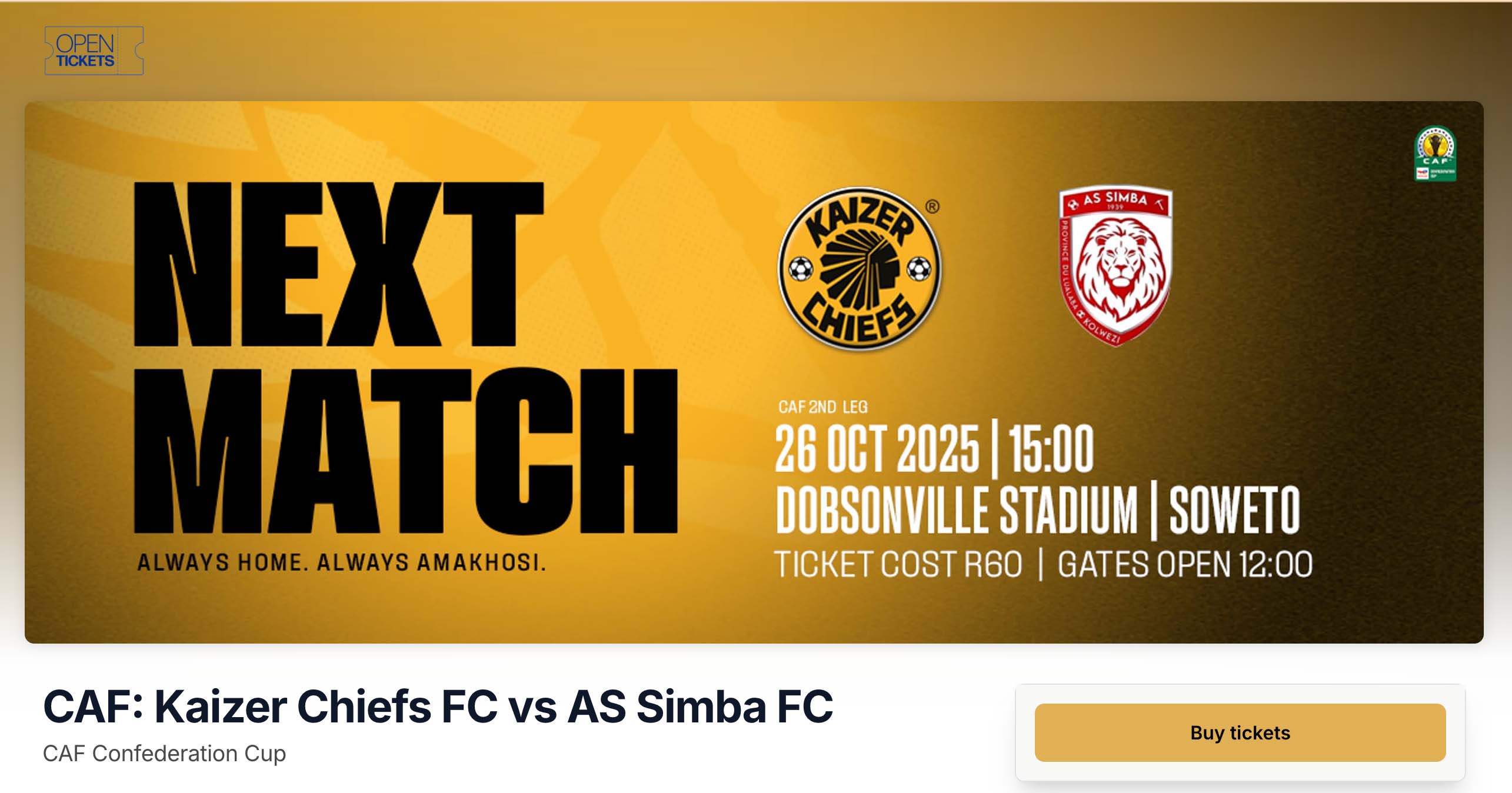 Amakhosi will be out to secure progression to the group stages of the TotalEnergies CAF Confederation Cup when they host Democratic Republic of Congo outfit, AS Simba on Sunday, 26 October in their second round, second-leg encounter at the Dobsonville Stadium in Soweto.